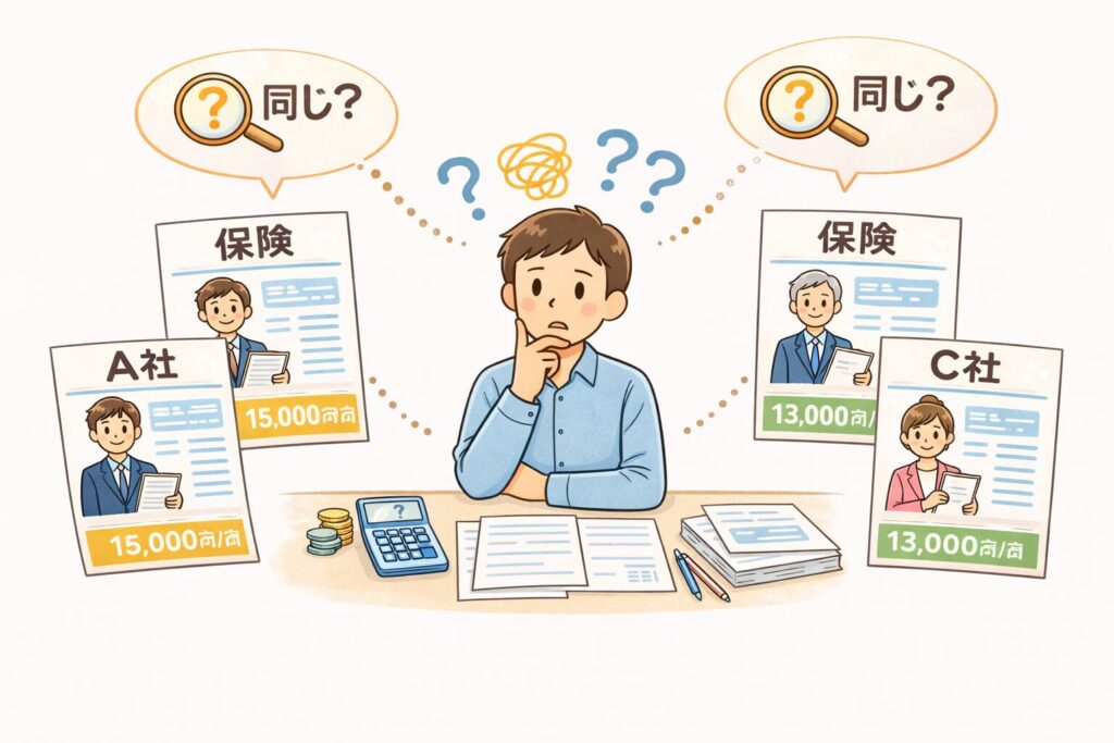 仮に比較したとしても、保険知識0の状態では、本当に同等内容で比較しているかがわかりにくいこともあります。
