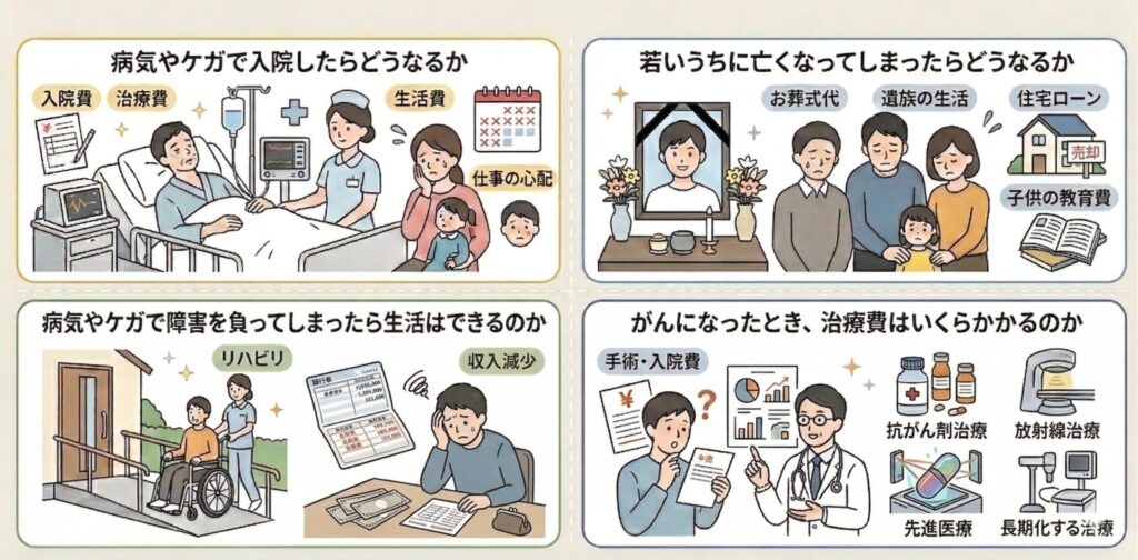 こうした貯蓄だけでは支えにくいリスクには、民間保険を検討する意味があります。