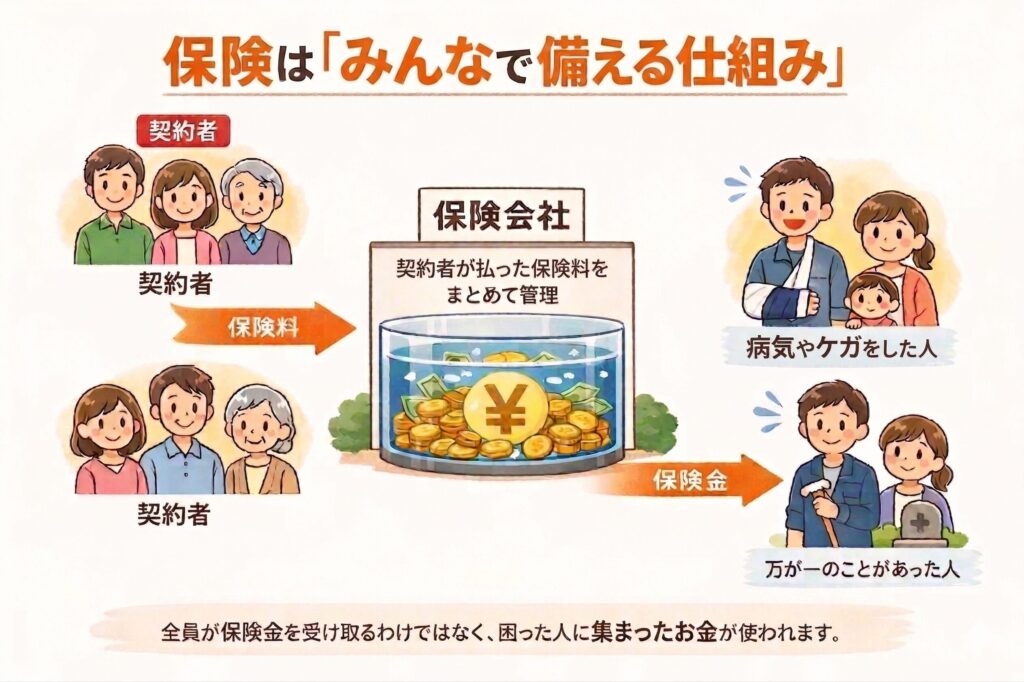 相互扶助とは、みんなでお金を出し合い、いざというときに保険金として受け取れる仕組みのことです。